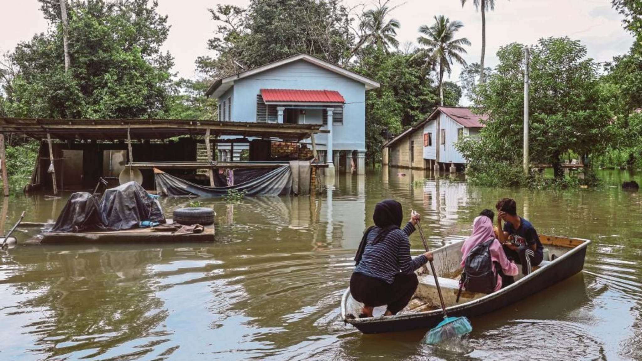 特别是甘榜区,由于地势低洼,暴雨导致大面积洪水。房屋和道路被淹,许多居民的日常生活受到影响,急需援助。