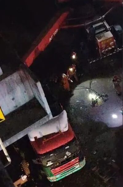 根据吉隆坡消拯局发言人表示,当晚接获报案称SPE高架桥下建筑工地有工人受伤,消拯员迅速抵达现场将该巴基斯坦籍工友送院治疗。与此同时,高架桥上发生另一严重交通事故,导致两名巫裔男子从桥上跌落至建筑工地,经医护人员确认,罗厘司机及随车员当场身亡。涉事罗厘车头和车身均有明显损毁,警方已介入调查该起连环事故,具体事故原因尚待厘清。