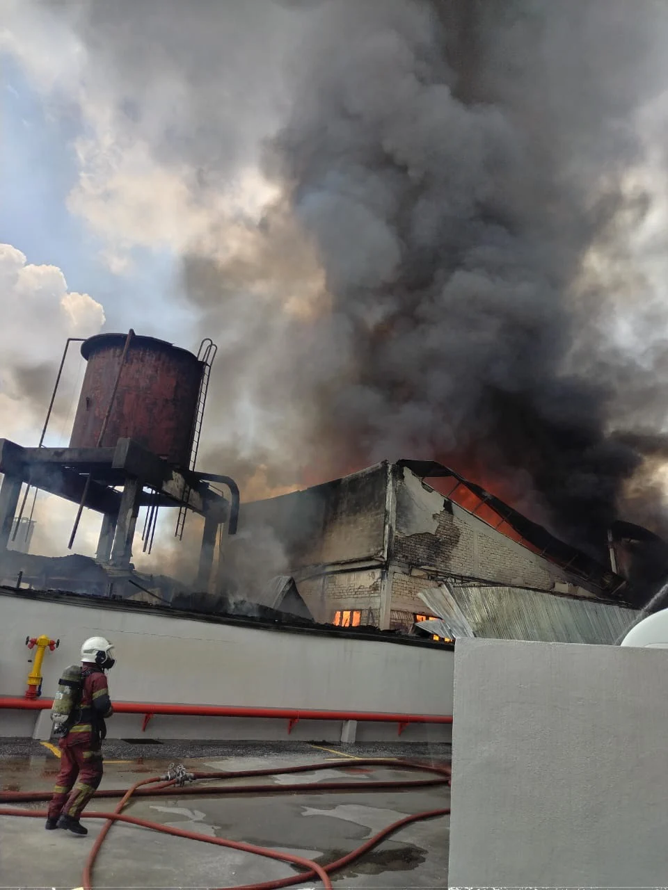 工厂占地约100乘50平方公尺,火势猛烈,浓烟不断升起,同时伴有爆炸声和黑色污水喷溅。消拯员在现场组织多路喷水灭火,同时观察火势扩散方向,以防火焰蔓延到周边设施。现场人员严格执行安全距离措施,确保灭火工作顺利进行。